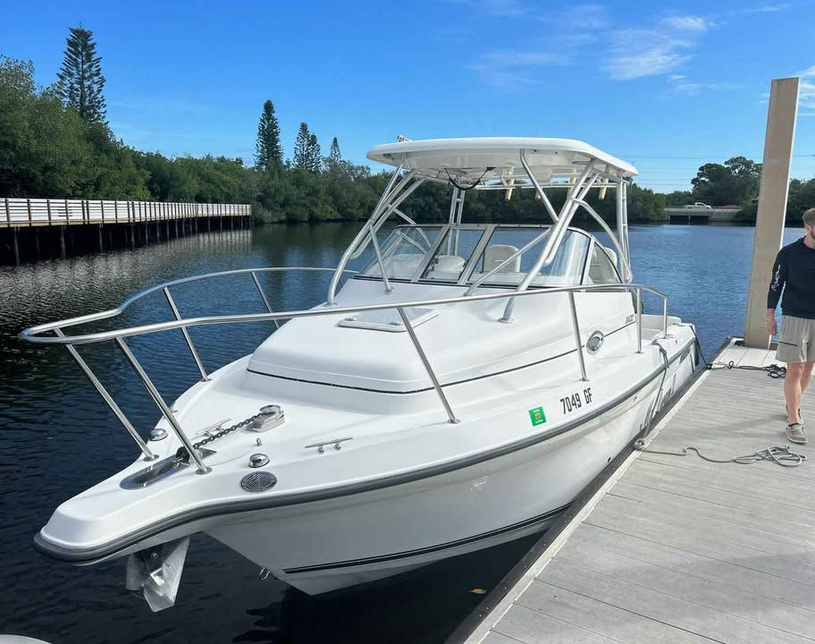 ✅ Features: Hardtop, Lowrance HDS8 MFD, Fusion stereo, dual fuel tanks, vacuum pump head, air conditioning, refrigerator, stove, fold-down rear seat, 30-gallon livewell, windlass, and tons of storage.